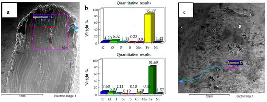 The effect of increasing the load from 10 N to 20 N for the coated sample at a refrigerant temperature of 20 °C is shown in Figure 12. Figure 12a shows the micrographs of the flat specimen. This image is very different from the image obtained at 10 N/20 °C. EDS analysis of the flat specimen reveals a very strong percentage of iron, indicating that the applied coating has not only been delaminated but has also been completely worn out throughout the wear track. EDS results of the wear scar show only traces of nickel and a slight presence of oxygen and fluorine. Comparing the EDS results of the flat coated sample to the flat uncoated sample under the same testing conditions shows a lesser presence of oxygen and fluorine, which implies that protective tribo-films are not well-formed in the case of the coated sample under these testing conditions. The micrograph of the ball sample shows a combination of abrasive and adhesive wear, with abrasive wear being the more dominant wear mechanism. In comparison to the flat steel sample, the EDS results of the ball sample show a stronger presence of oxygen and fluorine, indicating that under these testing conditions the tribo-films are being more easily formed on the ball sample.