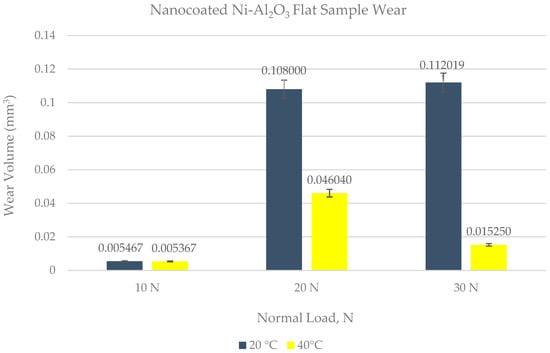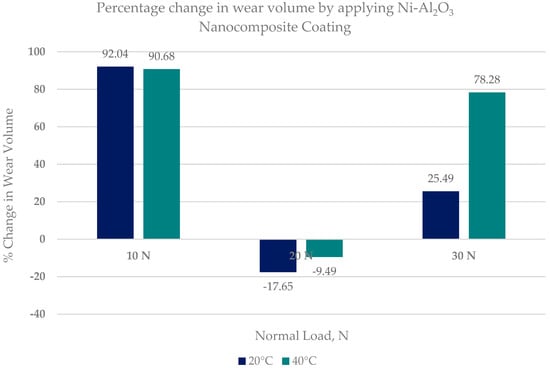 The least amount of wear for coated specimens was observed at a low load of 10 N and at a high refrigerant temperature of 40 °C. The percentage change in wear volume by using Ni–Al2O3 nanocomposite coatings in comparison uncoated samples is shown in Figure 20.