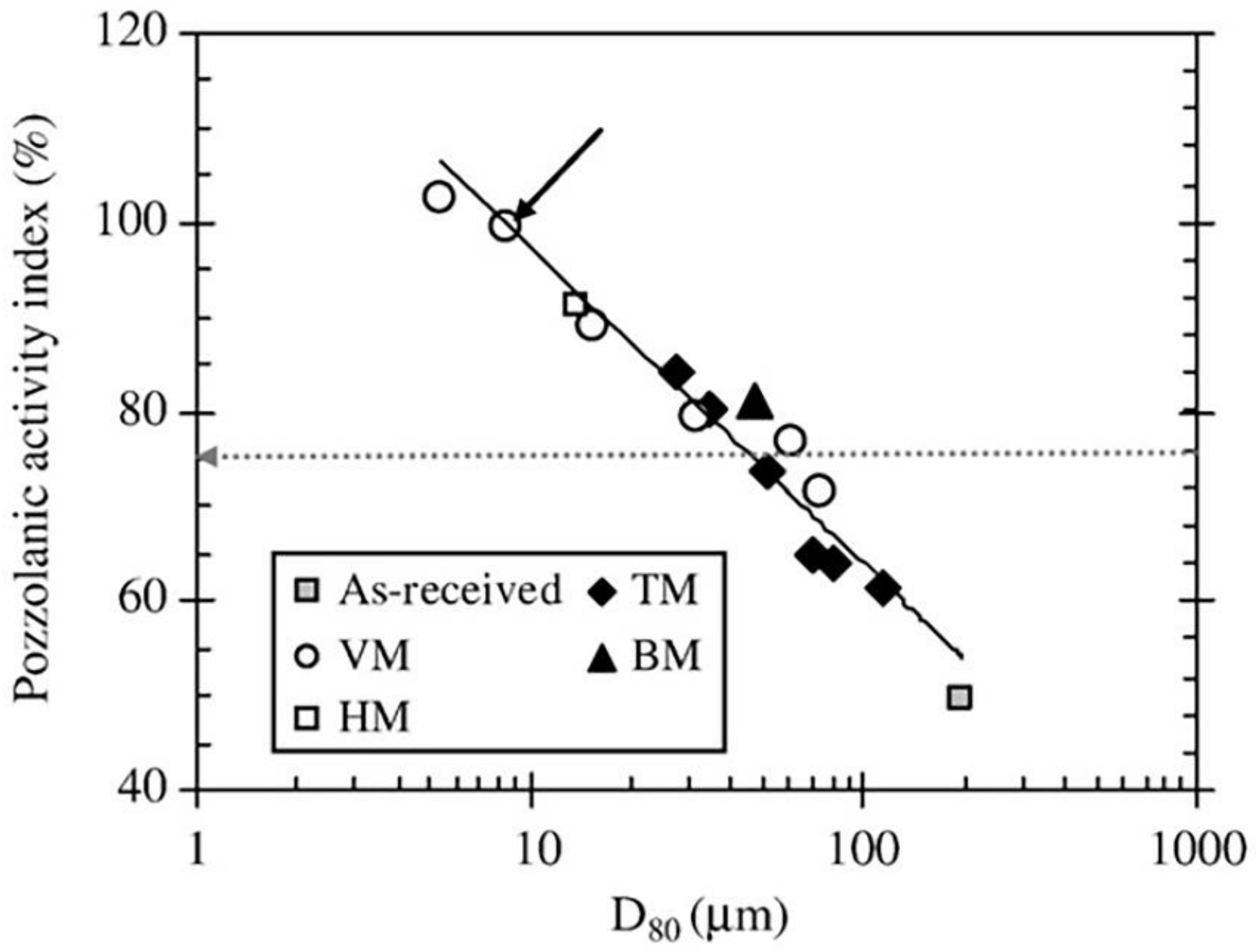 Figure 7. Relationship between pozzolanic activity index and D80. Reproduced with permission from [39].