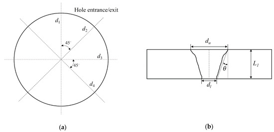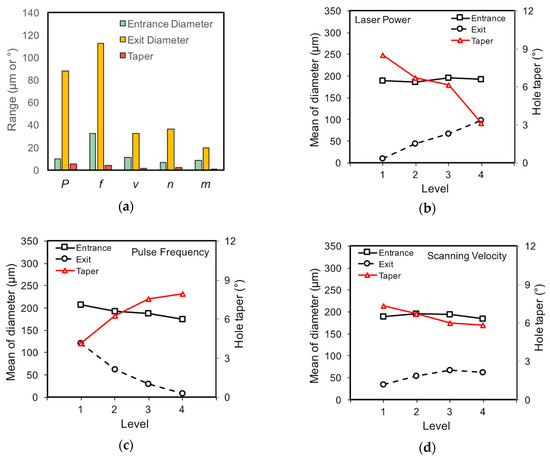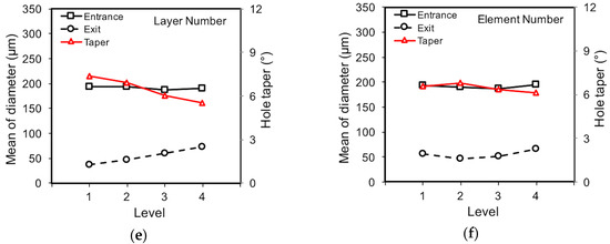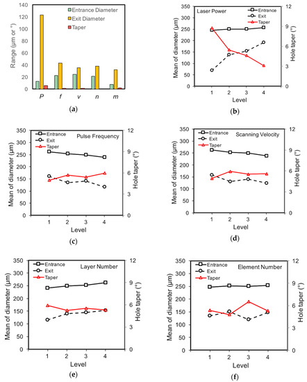 - Range analysis has been conducted. For laser dry trepanning, the pulse frequency outweighs the others in determining the entrance diameter, while the laser power and pulse frequency are the two parameters with more influence on the effects of the exit diameter and hole taper. In contrast, for NaOH solution-assisted laser machining, the laser power far surpasses the other parameters in affecting the exit diameter and hole taper, while the pulse frequency, scanning velocity, and layer number are associated with similar significance in affecting the entrance diameter. Based on the influence analysis, recommendations for the processing parameters have been given for chemical-assisted laser trepanning, including a higher laser power (level three or four), smaller pulse frequency (level one or two), faster laser scanning velocity (level three or four), and fewer layer numbers and element numbers (level one or two).