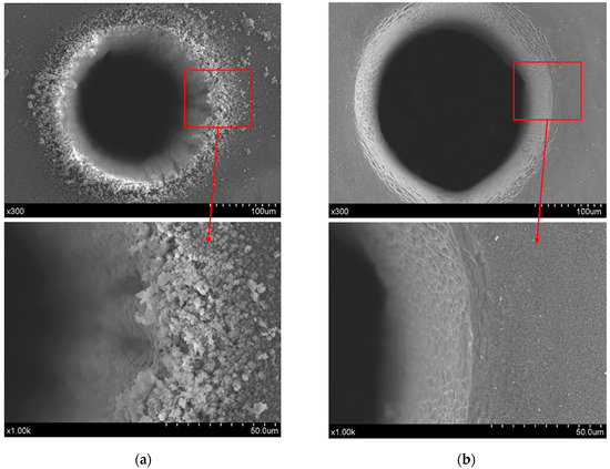 - Jiao, L.S.; Ng, E.Y.K.; Wee, L.M.; Zheng, H.Y. Role of volatile liquids in debris and hole taper angle reduction during femtosecond laser drilling of silicon. Appl. Phys. A Mater. Sci. Process. 2011, 104, 1081–1084. [Google Scholar] [CrossRef]