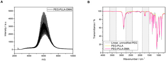 The successful synthesis of the PEG-PLLA cross-linker was previously proved by 1H-NMR spectroscopy [13]). Further DMF-GPC-analysis in the current study confirmed a monomodal distribution and narrow dispersity of Ð = 1.08 (Mn = 6789 g·mol−1, Mw = 7330 g·mol−1 in comparison to the expected value of 6498 g·mol−1; chromatogram not depicted in this publication). Also, MALDI-ToF measurements showed a mean molar mass of 6077 Da and clearly detectable PEG-units with m/z = 44 (see Figure 1A). Moreover, FTIR measurements revealed additional absorption bands for the first and second ester bond (ν = 2300 cm−1 and ν = 1725 cm−1). Unmodified, linear PEG with free hydroxy groups at both sides showed a strong signal of the PEG-backbone with its CH-valence vibration (ν = 2875 cm−1) and a slight alcohol OH-stretch at ν = 3455 cm−1. With esterification of the end functionalities, another signal appears in the wavenumber range of the corresponding carboxylic ester stretch at ν = ~1725 cm−1. In the second step of the synthesis, terminal PLA-units are transformed with methacrylic acid units and the incorporation of double bonds. The equivalent alkenyl C=C-double bond stretch appears at ν = ~2300 cm−1 (see Figure 1B).
