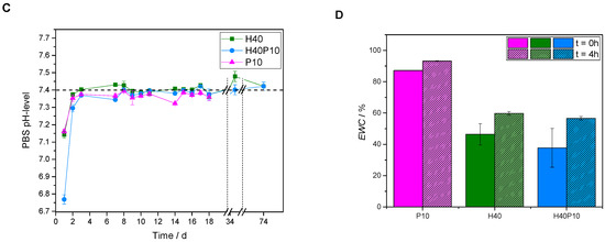Additionally, hydrogels of pure PEG-PLLA-DMA-cross-linker (P10) were analyzed. At the beginning, an increase in mass of about 50% was observed. Hydrogels behaved like expected for ester-containing substances (see Figure 3B): shortly after the cross-linking, an equilibrium state for the water-up-take of the hydrogel network was reached. This period lasted for about 12 days, until significant ester bond hydrolysis started. Samples became instable, fragmented and were broken after 18 days (see Figure 3A; Damage of structure). Due to the breakdown of the structure indicated by the decrease in mass and high standard deviations due to the loss of fragments, a mass determination was feasible any more. This was only observed for P10, whereas that for HEMA-containing formulations the short and low molecular weight polymers are the dominating factor. In addition to mass change development, pH-values of PBS storage solution were measured. First pH-levels of all batches (day 1) started in acidic regions of 6.75 for H40P10 and 7.15 for H40P10 as well as P10. After three days, reached values were in the physiological range about a pH of 7.4 indicating very low release of acidic degradation products (see Figure 3C). To characterize also uptake of water, EWC of the different hydrogels was determined in the range of immediately after production (t = 0 h) and after 4 h. Hydrogels based on the self-synthesized cross-linker showed a very high EWC of about 80–90% after 4 h. In contrast to that, gels based on pHEMA (H40 and H40P10) reached lower EWC-values of about 40 % for the first time point and increased up to 50% after 4 h (see Figure 3D).