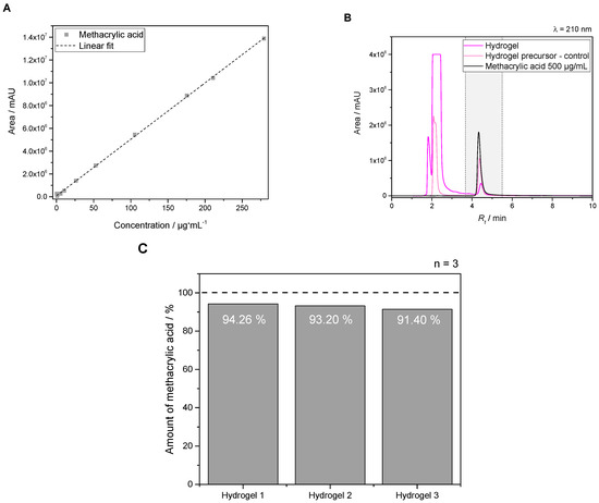 Free methacrylic acid added to the eluent was used as standards for calibration within the range of 0.05–280 µg·mL−1. A linear correlation with a regression coefficient R2 of 0.9997 and a linear equation of y = 49,645x + 63,906 was obtained for calibration (see Figure 4A). Furthermore, retention time (Rt) of the analyzed compound was 4.3 min within a run duration of 10 min. Figure 4B gives an overview of a chromatogram at λ of 210 nm showing the pure hydrogel precursor as control, the hydrolyzed hydrogel itself as well as a methacrylic acid standard with a concentration of 0.5 mg·mL−1. HPLC measurements verified a very high degree of cross-linking efficiency by reaching 92.95% ± 1.45 of acid units for PEG-PLLA-DMA-hydrogels (see Figure 4C).