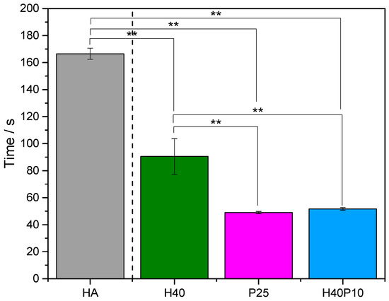 Initial setting times of pure inorganic reference HA in comparison to the composite formulations with 40 wt% HEMA (H40), HEMA in the same concentration combined with 10 wt% degradable cross-linker (H40P10) as well as a hydrogel phase produced out of 25 wt% polymer (P25). ** p < 0.001.