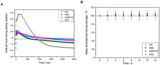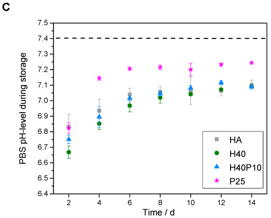The additional polymer phases incorporated in inorganic matrix also influenced initial pH-development. Pure HA showed a setting reaction under alkaline conditions with a basic pH-maximum of 9.4 after 2 h. A drop down of the pH-level after 24 h resulted in a still decreasing plateau phase under the physiological pH-level (see dotted line in Figure 6A). By addition of pHEMA and/or PEG-PLLA-based cross-linker, respectively, maximum pH-values decreased to a pH of 8 with a relatively constant and slow shift to 7.4. No swelling or increase in mass was observed over 8 d of storage (see Figure 6B). Moreover, all PBS media showed acidic conditions after 2 d in the range of 6.7–6.9. Over two weeks, pH-values increased up to 7.0–7.2 and approximated a pH-level of 7.4 (see Figure 6C).
