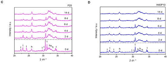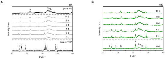 XRD-diffractograms of pure hydroxyapatite (HA) in comparison with composite batches. All formulations converted to HA over 14 days. With increasing polymer content, amorphous phases increased. Furthermore, a higher polymeric content also increased the time frame for HA formation (h = diffraction pattern HA, t = diffraction pattern α-TCP). (A) Inorganic reference HA in comparison to the reference diffraction pattern of pure α-TCP and HA, respectively; (B) HA with polymeric addition of 40 wt% HEMA (H40) in liquid phase; (C) HA with polymeric addition of 25 wt% synthesized hydrogel precursor (P25) in liquid phase; (D) HA with combination of 40 wt% HEMA and 10 wt% cross-linker (H40P10) in liquid phase.
