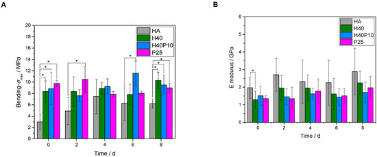An increase in bending strength, as well as ductility and flexibility, was achieved by addition of the polymeric phase. Four-point bending strength could be significantly increased from about 6 MPa for the pure reference without polymeric additions to about 9 MPa for the samples with organic hydrogel phase (see Figure 10A). For different polymers, highest value of about 10 MPa was observed for the combination of 40 wt% HEMA with 10 wt% cross-linker (H40P10). Although pure hydrogel phases based on pHEMA seemed to have higher viscous and elastic behavior (G’ respectively G’’ with highest value, see Figure 2A), a four-point-bending strength in the same range of batch H40 could be measured for the pure cross-linker, i.e., the hydrogel system based on degradable methacrylate modified triblock PEG-PLLA-DMA-monomers. Over the time frame of 8 days, all dual-setting systems showed a relatively stable value of four-point bending strength in comparison to the reference where the strength increased related to the time-dependent hardening process of the cement. HA references had higher E-modulus values between 2 and 3 GPa in comparison to the dual set formulations. Lowest E-moduli and thus highest elasticity and lowest slope were determined for samples containing 25 wt% cross-linker (P25). This observation refers to the determined density of hydrogels and EWC showing highest elastic behavior (see Figure 10B). Highest energy absorption capacity and toughness was given by the combination of both, short and long chain polymers that formed an incorporated, homogenous hydrogel network (H40P10, see Figure 10C). Calculated elasticity was significantly advanced by the different hydrogel phases whereas a combination of 40 wt% HEMA and 10 wt% PEG-PLLA-based hydrogel precursor showed the overall highest effect (see Figure 10D).