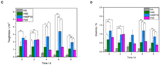 Overview of different parameters calculated out of four-point bending test. First, maximum bending strength of all batches over a period of eight days was determined (A). Furthermore, a calculation of relevant measures for evaluating influence of polymeric additions was performed: E-modulus (B), toughness (C), and elasticity (D) of the system. * p < 0.05; ** p < 0.001.