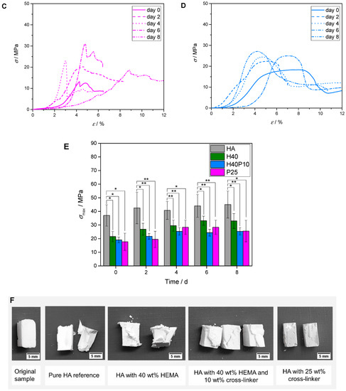 Stress-strain curves of inorganic reference in comparison to composite materials as well as overview of maximum stress-values over 8 d. (A) Inorganic reference (HA) with typical brittle behavior—high initial stress with low strain-levels; (B) Formulation containing 40 wt% HEMA in liquid phase (H40) showing an increase in ductility with high stress-values comparable to pure HA cement; (C) Samples based on 25 wt% cross-linker (P25) with increase in ductility; (D) Most ductile system composed of HEMA (40 wt%) and hydrogel precursor (10 wt%) with plateau phases instead of maximum stress peaks and deformations up to 10%; (E) Maximum stress of all batches during time frame of 8 d. Image (F) depicts specimens before and after compressive strength testing at day 0. * p < 0.05; ** p < 0.001.