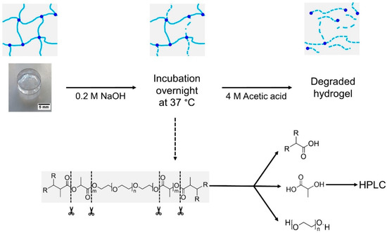 Schematic overview of determined degree of methacrylation as well as amount of cross-linked free methacrylic acid. Different steps of the procedure starting from basic hydrolysis with incubation overnight to protonation of methacrylic acid until a complete degradation of the hydrogel is obtained. This compound was analyzed via HPLC according to a procedure of Abbadessa et al. [16].