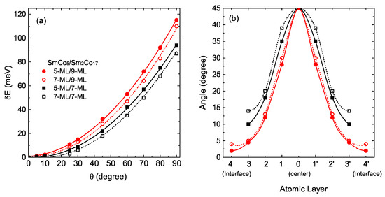 (a) The calculated total energy difference, E() = E() − E( = 0) and their fitting to a quadratic curve for the four systems with various atomic thickness; (b) The angle distributions for the soft phase atomic layers parallel to the interface plane (refer to Figure 1). 0 label represent centered layer which is the middle layer of the soft phase, whose atomic magnetic moments are turned at a fixed value of 45 away from those in the hard phase layers. All the atomic magnetic moment orientation in layers 1 (1), 2 (2), 3 (3), and 4 (4) are obtained self-consistently.
