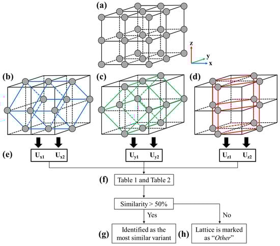 The procedures of the martensite variant identification method is illustrated in Figure 1. The method identified the phases and variants by examining each group of eight cubic unit cells (Figure 1a) in the model, which consisted with six distorted tetragonal unit cells (two for each of the x, y, z axes, as shown in Figure 1b–d) [21] under the given loads. The transformation matrices of the distorted tetragonal unit cells can be determined, i.e., , as shown in Figure 1e. Next, the similarity of the determined transformation matrices was checked (Figure 1f) with the ideal/theoretical transformation matrices of each variant in the orthorhombic (O phase) and monoclinic (M phase) crystal systems listed in the literature [22]; where the similarity was defined and quantified by the 15 conditions modified from Yang and Tsou [17] as shown in Table 1; where is the component of the transformation matrix ; is the tolerance with the value of 0.012, which allows more than 99% of the lattices in the crystal at a temperature above the to be identified as the austenite phase (A phase).