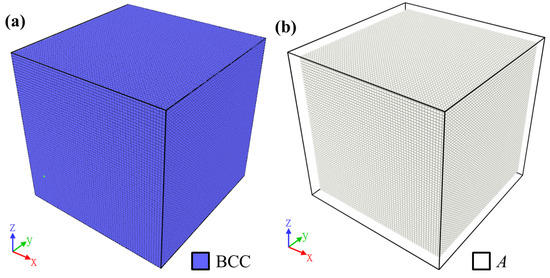 The results of the compression test along the y axis were generated. The NiTi crystal at the initial state was built in the austenite phase as described in Section 2.1. The austenite phase in the model was identified as the body-centered cubic (BCC) lattice structure by PTM, marked in blue, as shown in Figure 2a, and in white by the martensite variant identification method, as shown in Figure 2b. Initially, the whole model did not have dislocation, and the deformation gradient value was zero.