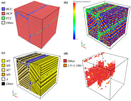 Similar arrangements can be observed in Figure 3a–d, and the martensite variant identification method was able to reveal sufficient information and details in the MD results. This shows the validity and the advantage of the method. Thus, it will be used to analyze the microstructure in the following section.