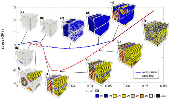 Figure 4 shows the stress-strain curve and the corresponding microstructural evolution due to the compression along the y axis. The initial state of the crystal was in the A phase, as shown in Figure 4a. Then, the crystal showed a linear stress-strain relationship, and the stress dropped due to the distorted lattices, indicated in blue at Stages (b) and (c). Note that these distorted lattices were identified as variants O3 and O4, further forming a stripe twin pattern, as shown in Figure 4d. Next, the two O phases transformed to the M5–M8 variants abruptly, indicated in the red circle in Figure 4e. This phase transition also caused a slight drop in the stress. It is worth noting that the results showed that the O phase served as a transitional phase between the A phase and M phases, i.e., the cubic lattice of the A phase firstly enlarged along a direction to become the O phases and then switched again to one of the M variants. This phenomenon was also reported in the literature [23].