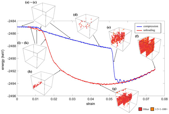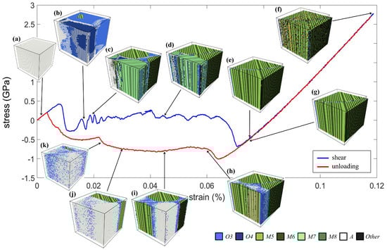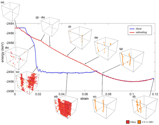 The energy profile and the distribution of the dislocations are shown in Figure 10. It can be observed that the onset of the martensitic transformation due to the shearing (around 1%) was earlier than the compression and tensile test. When the O phase appeared (Figure 9b), a small amount of dislocations occurred, as shown in Figure 10b. Then, the dislocations significantly increased at the twin interfaces in the herringbone structure as the crystal transformed from the O phases to the M phases, as shown in Figure 10c–d. At the same stage, the total energy also decreased abruptly. It is interesting that although the crystal was stressed by the further shearing, the energy was minimized due to the change of the type of dislocations, as shown in Figure 10e. After Stage (e), the dislocations migrated toward each other when shear strain increased and moved away from each other during the unloading, as described in literature [8]. This enabled a steady and linear increase of the energy, and the crystal returned to the original state without any residual dislocation (Stages (g)–(k)).