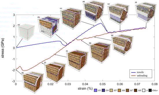 The stress-strain curve and the corresponding microstructures of the uniaxial tensile test along the y direction are shown in Figure 6. The crystal adopted a perfect austenite structure initially and then underwent a linear elongation. Then, the stress decreased slightly when the strain reached about 3.0%. This is because of the phase transformation from the A phase to the M phase. It is worth noting that there was no significant O phase involved in the martensitic transformation in the tensile case compared with the case of the compression test. Thus, there was no obvious plateau in the curve in this case. The crystal then quickly adopted the herringbone pattern consisting of variants M1–M4. It is interesting that, when the strain was about 5.0%, the crystal adopted another self-accommodating microstructure, which led to a significant stress reduction, as shown in Figure 6d. Based on the martensite variant identification method, this microstructure can be regarded as two diamond-shaped martensite regions (M1–M2 and M3–M4 twins) surrounded by wedge-shaped regions (identified as the A phase). This interesting microstructure will be discussed in more detail later. When the maximum tensile strain 7.5% was reached, many lattices in the crystal were largely distorted, and thus identified as the “Other” phase. Even so, the microstructure remained unchanged (Figure 6f,g) until the strain returned to about 3.5%.