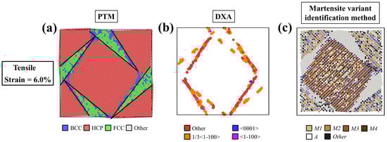 The self-accommodating microstructure induced at the tensile strain of 6%, visualized by (a) PTM, (b) DXA (dislocation analysis), and (c) the martensite variant identification methods.
