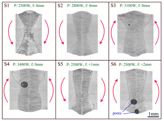The cross-sectional profile of cases S1–S6. P represents laser power, while f means focus offset. The red arrows show actual angular distortion directions.