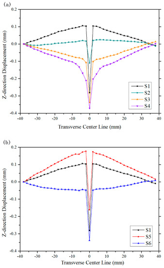 The Z-direction displacements of transverse center line of cases S1-S6. (a) Z-direction displacements of various laser powers. (b) Z-direction displacements of various focus offsets.