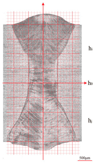 In order to obtain the data of profile asymmetry, a cartesian coordinate system was established upon the cross-section image, as shown in Figure 5. The lengths of the at different heights hi above the center line h0 were measured, as well as lengths of the at different heights hj down h0. Table 1 shows the cross-section profile of case S1.