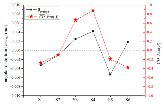 The measured angular distortions and calculated of cases S1–S6.