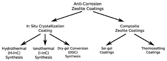 Depending on the support and purpose of use, different deposition techniques can be identified as suitable for anti-corrosion zeolite metal coating [17,18]. Figure 1 summarizes the synthesis techniques, grouped in two main families: in situ crystallization coatings and composite zeolite coatings. In the former, a direct synthesis of zeolite in the metal substrate is obtained. In the latter, the zeolite is used as a filler of a matrix with layer capabilities.
