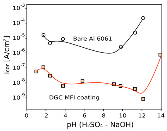 The high efficiency of DGC coating can be also related to a proper crystal morphology where zeolite nanocrystals are well packed compared to InC technique thus increasing the zeolite layer resistance [36]. More recently Tsai et al. [36] compared anti-corrosion performances of MFI coatings on AA6061 alloy obtained by in situ crystallization and dry-gel conversion, respectively (Figure 5). MFI zeolite coatings showed a significant corrosion resistance in the whole pH range, evidencing corrosion current five order of magnitude lower than the uncoated Al alloy in NaCl solution. Furthermore, they indicated that protection ability of zeolite coating is attributed to the increased film resistance associated with a dense and impermeable zeolite layer. In particular, by using the dry-gel conversion method as deposition technique was possible to favor the grown of high packing density zeolite layer with higher barrier action that than the in situ crystallization grown film.