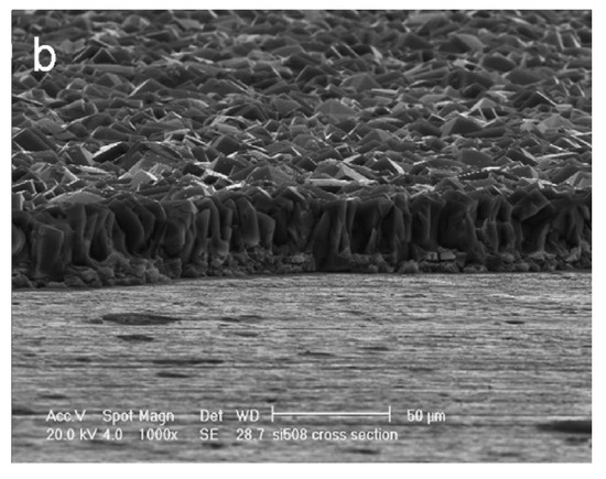 Analogously, Wang et al. [61], assessing MFI zeolite coatings growth on AISI 304 stainless steel by hydrothermal synthesis, showed that crystal morphology and orientation can be controlled by a correct optimization of the synthesis composition. In particular, well oriented MFI zeolite layers were obtained in medium OH−/Si (e.g., OH−/Si = 0.32) and low Na+/TPA+ ratios (e.g., Na+/TPA+ < 0.31).