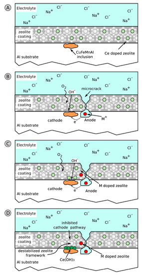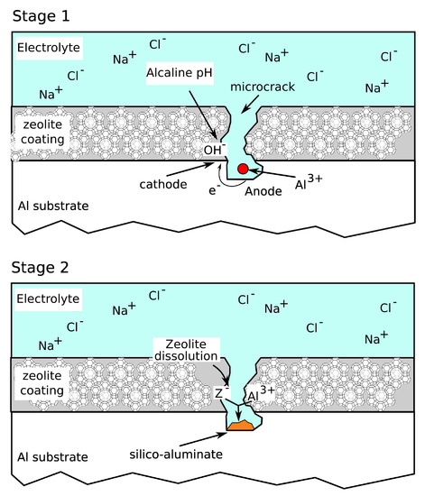 The anti-corrosion behavior of zeolite-based coatings can be partially related to the electrochemical properties of the zeolite itself. Although zeolites are electronic insulators, electronic transfer is at the basis of their electrochemical response, and different transfer mechanisms have been proposed [74,75,76]: (a) extra-zeolite electron transfer, (b) intra-zeolite electron transfer and (c) electron transfer to/from species located at the outermost boundaries of the zeolite particles.