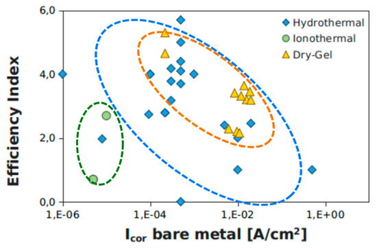 In Table 1, a brief summary of some scientific articles focused on the anti-corrosion performances of zeolite-based coatings obtained by hydrothermal and ionothermal in situ crystallization techniques is reported. In particular, the main information related to coating typology, synthesized in order to evaluate their effectiveness as a protective coating against corrosion, is indicated. The table shows that most of the supports on which zeolite coatings have been made were an aluminum alloy. The performance of the coating has been investigated in multiple environmental conditions, ranging from chloride environments up to acidic [46] or strongly alkaline (pH 12.5) [47] electrolytes. Coatings based on zeolite have been found to have an effective anticorrosive behavior, with a reduction of the corrosion current by up to 5 orders of magnitude compared to the uncoated support.