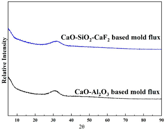 The glassy samples were prepared by the conventional melting and water-quenching method. The mixed sample was placed in a platinum crucible and melted in a high-temperature furnace with molybdenum silicide as the heating element at approximately 1623 K (1350 °C). In order to achieve complete melting and homogenization, the mold flux samples were held at 1623 K (1350 °C) for 2 h. Then, they were quenched with water. The quenched samples were characterized by X-ray diffraction (XRD), as shown in Figure 1. Both exhibited amorphous properties.