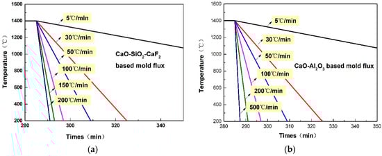 A diagram of the cooling process at different cooling rates in (a) a CaO–SiO2–CaF2-based mold flux and (b) a CaO–Al2O3-based mold flux.