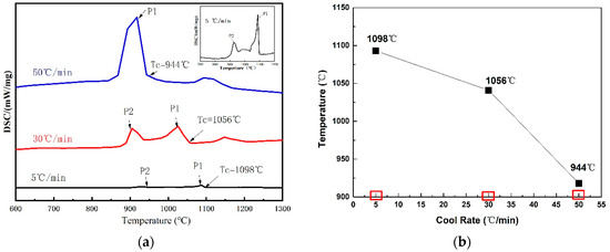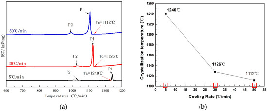 (a) DSC curves of non-isothermal crystallization of the CaO–Al2O3-based mold flux at the cooling rates of 5 °C·min−1, 30 °C·min−1, and 50 °C·min−1. (b) The crystallization temperatures at the cooling rates of 5 °C·min−1, 30 °C·min−1, and 50 °C·min−1.