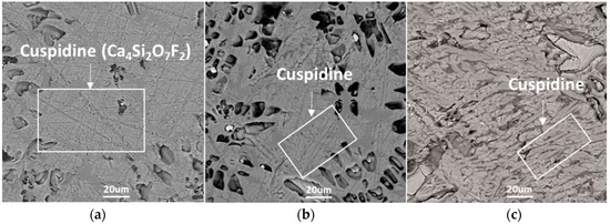 In order to identify the phases and crystal morphologies, the samples taken from the DSC measurements were characterized by SEM–EDS, as shown in Figure 4. The main phase was identified as cusipdine (CaO·2SiO2·CaF2) at all cooling rates. According to the phase equilibrium study on the CaO–CaF2–SiO2–Al2O3 flux system carried out by the present author [20], cuspidine, as the primary crystal in mold fluxes with basicity higher than R = 1 (R = CaO mass%/SiO2 mass%), was firstly formed. The main morphology of cuspidine was faceted at the cooling rates of 5 °C·min−1 and 30 °C·min−1. When the cooling rate increased to 50 °C·min−1, the morphology of cuspidine changed to fine stripe. It can be concluded that a high cooling rate could induce a morphology transition in the crystallized cuspidine. In addition, the phases decreased with the increasing cooling rate.