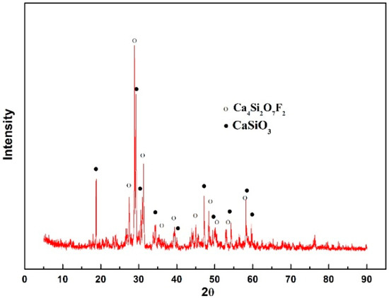 Because the phase identification by SEM–EDS after the DSC measurements of the CaO–SiO2–CaF2-based mold flux could not determine the corresponding crystalline phases of the two exothermic peaks, heat treatment experiments were carried out to analyze the crystalline phase precipitation in the mold fluxes at the cooling rate of 5 °C·min−1. After the heat treatment experiments, the samples were subjected to XRD analysis to identify the specific crystalline phase. The results are shown in Figure 5. It was seen that cuspidine and CaSiO3 co-precipitated in the CaO–SiO2–CaF2-based mold flux. The fact that only cuspidine was observed in SEM may be because the second phase, that is, CaSiO3, precipitated at a lower temperature with a small crystal size.