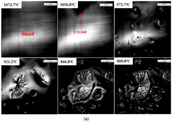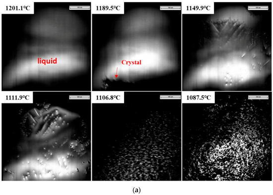 In situ observation of crystallization was performed using a halogen lamp heating stage and a confocal scanning laser microscope (CSLM, VL2000DX, Lasertec Corporation, Yokohama, Japan). The platinum crucible containing the samples was rapidly heated by the light irradiated by the halogen lamp. In the cooling process, the crystallization phenomena were recorded by in situ observation of the surface of the slags. After the sample reached thermal equilibrium, the melt was cooled at a designated rate, and video images of the molten slag were collected during the non-isothermal stage. The nucleation and growth process of the crystals in the investigated mold fluxes were observed during continuous cooling of the slag at fixed rates from 100 to 500 °C·min−1.