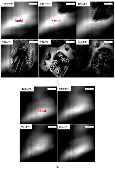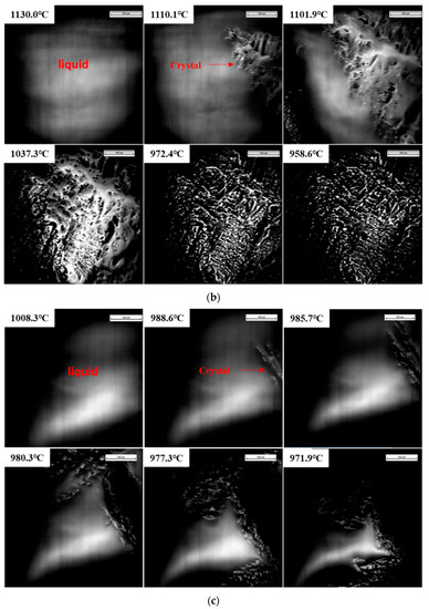 The crystallization process of the CaO–Al2O3-based mold flux measured by CSLM at different cooling rates: (a) 100 °C·min−1, (b) 300 °C·min−1, and (c) 500 °C·min−1.