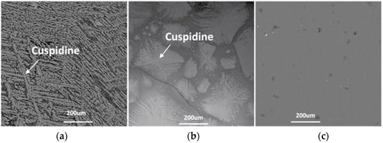 The effect of high cooling rates on the phase and crystal morphology transitions of the CaO–SiO2–CaF2-based mold flux was analyzed by CSLM. Figure 6a–c show the crystallization process of slag at the cooling rates of 100 °C·min−1, 150 °C·min−1, and 200 °C·min−1, respectively. As we know, liquid fluxes present as a bright white field in CSLM experiments. It was observed that the primary phase precipitated from the molten fluxes, then started to develop, and the liquid phase gradually reduced as the temperature gradually decreased. When the cooling rate was increased to 200 °C·min−1, there was no crystallization observed throughout the whole cooling process. The onset of the nucleation and growth of primary crystals is shown in Figure 6a,b. It was observed that the morphology of cuspidine was the blocky shape. When the temperature gradually decreased, distinct dendrites were observed in the blocky-shaped crystal. It was further confirmed by the SEM results in Figure 7a that cuspidine presented fine stripe dendrites at the cooling rate of 100 °C·min−1. This is similar to the morphology of cuspidine at the cooling rate of 50 °C·min−1. When the cooling rate was increased to 150 °C·min−1, the morphology of the cuspidine transformed to the flocculent dendrite shape.