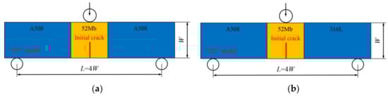 Different material constraints were obtained by changing the width (the direction perpendicular to the initial crack) of 52Mb or 52Mw in each model. For the “121” and “123” models, changing the width of 52Mb from 0 to 80 mm. When the width of 52Mb is 0 mm, the welded joint is the same as the A508 and 316L homogeneous material models, respectively; when the width of 52Mb is 80 mm, the welded joint is same as the 52Mb homogeneous material model. For the “12321” and “12324” models, the widths change to 52Mb and 52Mw, respectively. When changing the width of 52Mb individually, the width of 52Mw is fixed to 1mm, and changing the width of 52Mb from 0 to 80 mm; when changing the width of 52Mw individually, the width of 52Mb is fixed to 1 mm, and changing the width of 52Mw from 0–39.5 mm.