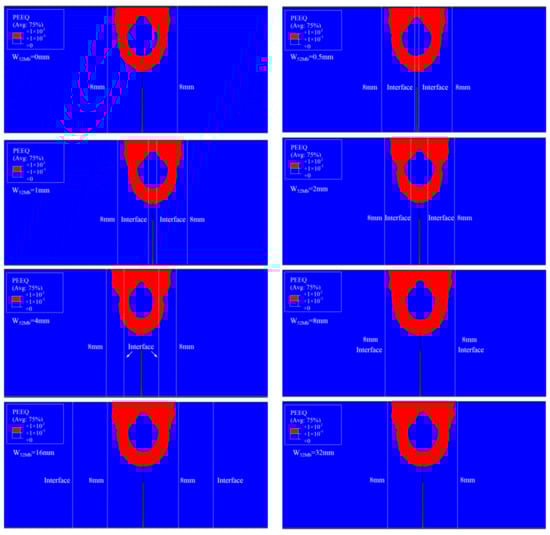 Figure 6 shows the distributions of equivalent plastic strain εp = 0.1 isoline at crack tip at the same J-integral (J = 1600 kJ/m2) for different “121” models. It can be found that though the distributions of equivalent plastic strain are different for different models, but the equivalent plastic strains surrounded by εp = 0.1 isoline are within the scope of 8 mm for all the models. When the interface is located within this scope, the J-resistance curve will be affected by the material constraint; when the interface is located outside this scope, the J-resistance curve will not be affected by material constraint. This scope is the effect range of the material constraint.