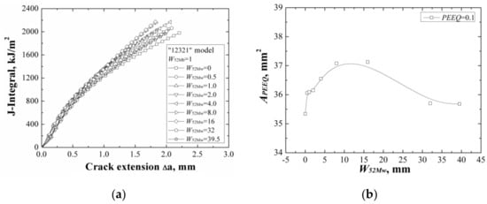 When changing the width of 52Mb individually, the J-resistance curves of different “12324” models under different material constraints are shown in Figure 12a. It can be found that increasing the width of 52Mb, the J-resistance curves of the models increase firstly then decrease, and finally remain steady. The models with W52Mb = 0 mm and W52Mb = 0.5 mm have the lowest J-resistance curves and the model with W52Mb = 2 mm has the highest J-resistance curve. When the width of 52Mb up to 8 mm, the J-resistance curve will not change by increasing the 52Mb’s width.