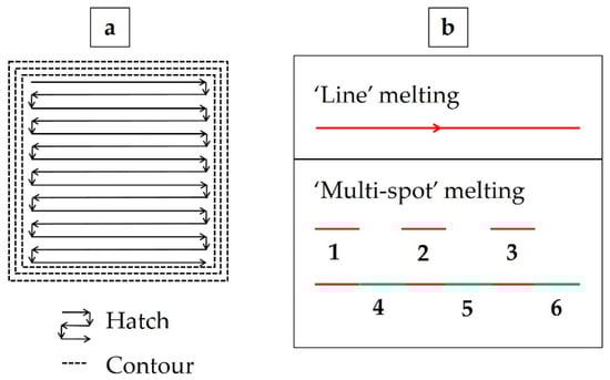 (a) Schematic image representing the difference in melting strategy between contour and hatch (as seen perpendicular to the layers). Note: There is overlap between the individual points and the lines as well as between the contour and the hatch in the melting strategy. (b) Schematic image representing ‘line’ melting and ‘multi-spot’ melting strategies.