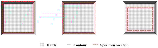 Specimens for fatigue testing were prepared by machining and low stress grinding after the thermal post-treatments. Out of all the specimens used for fatigue testing, 30 were machined on all four sides, whereas 18 other specimens were machined such that three sides were completely machined and one of the sides was machined partially to retain the “raw” as-built surface. The “raw” as-built surface was retained for 40 mm in the middle of the partially machined side. This was performed to facilitate proper contact between the rollers in the test fixture and the specimens (at the machined areas). Out of the 30 completely machined specimens, 18 were machined to have 10 mm × 10 mm sides, while 12 others were machined to a smaller 6 mm × 6 mm sides. The smaller specimens were machined such that only the hatch region was present and the entire contour region was removed (see the schematic representation in Figure 3). All specimens were 80 mm long and the edges were rounded off suitably to avoid edge effects. The machined surfaces were finished to a Ra value of 0.2 µm. A summary of the specimen conditions is presented in Table 3.
