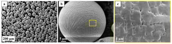 The feedstock used in this study was pre-alloyed virgin powder of Alloy 718, manufactured by plasma atomization. The powder particles were spherical with a minimal amount of satellites, as shown in the low magnification secondary electron (SE) image in Figure 4a. The high magnification SE images, Figure 4b,c, show the surface morphology of the powder that had a dendritic structure. Furthermore, the surface morphology of the powder is typical of the virgin powder without the presence of any particulate oxides.