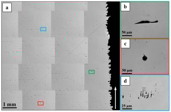 (a) Microstructure of the as-built material showing the different defects present. (b) Lack of fusion; (c) gas porosity; (d) shrinkage porosity. The arrow indicates the building direction.