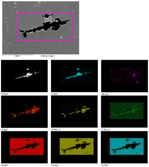 An energy dispersive x-ray spectroscopy (EDS) map around a LoF defect showing the presence of aluminium oxide and titanium nitride. Note: ‘Electron image 1′ is a backscatter electron image and the oxide and nitride appear black due to the atomic number contrast.