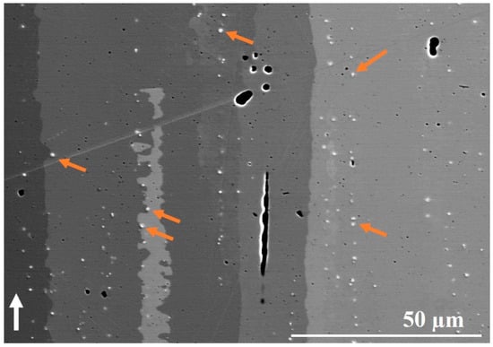 High magnification the BSE image showing strings of vertically aligned carbides. The white arrow indicates the building direction. Some of the carbide particles are indicated by arrows. Note: For the sake of brevity, the image showing carbide distribution is presented only for the STA condition.