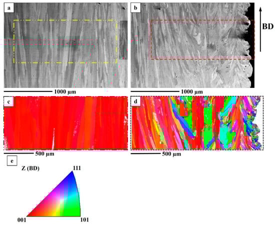 An STA specimen. (a) BSE image of hatch region; (b) BSE image of contour region; (c) EBSD IPF map of hatch region indicated in (a); (d) EBSD IPF map of contour region indicated in (b). (e) IPF map legend to interpret (c,d).